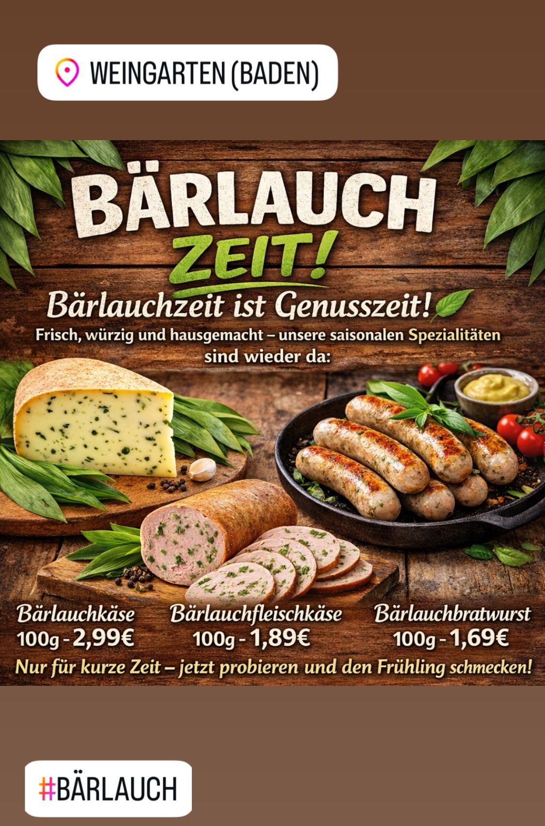 Die Bärlauch Saison ist gestartet - testet jetzt unbedingt unsere leckere Bärlauch-Bratwurst und weitere Spezialitäten.